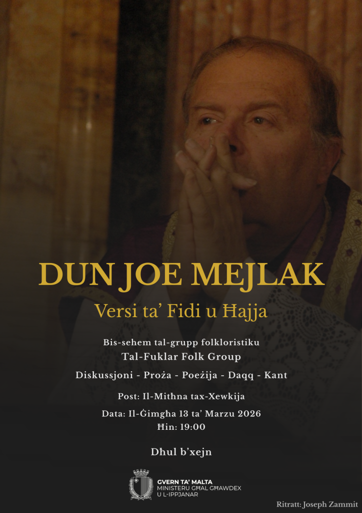 Dun Joe Mejlak: Versi ta’ Fidi u Ħajja is a cultural and literary event featuring discussion, prose, poetry, recitation, and song inspired by the spiritual and human legacy of Dun Joe Mejlak. It is open to the public, offering an opportunity to reflect on faith, life, and Maltese artistic expression through a rich program of performances and dialogue.