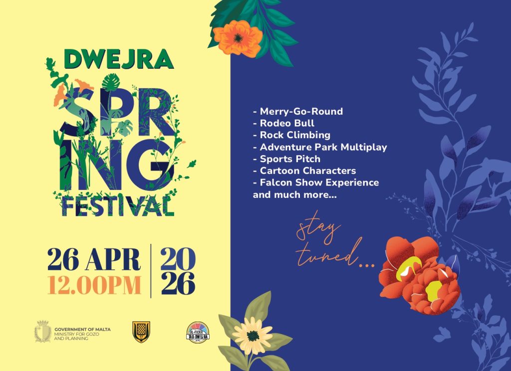 The Dwejra Spring Festival is a vibrant celebration packed with fun for all ages, bringing together adventure, entertainment, and family-friendly experiences in one lively event. Visitors can enjoy exciting attractions such as a merry-go-round, rodeo bull, rock climbing, adventure park multiplay, and sports activities, alongside interactive cartoon characters and a captivating falcon show experience. With a colorful atmosphere and plenty more surprises to discover, the festival promises an unforgettable spring celebration full of energy, laughter, and memorable moments.