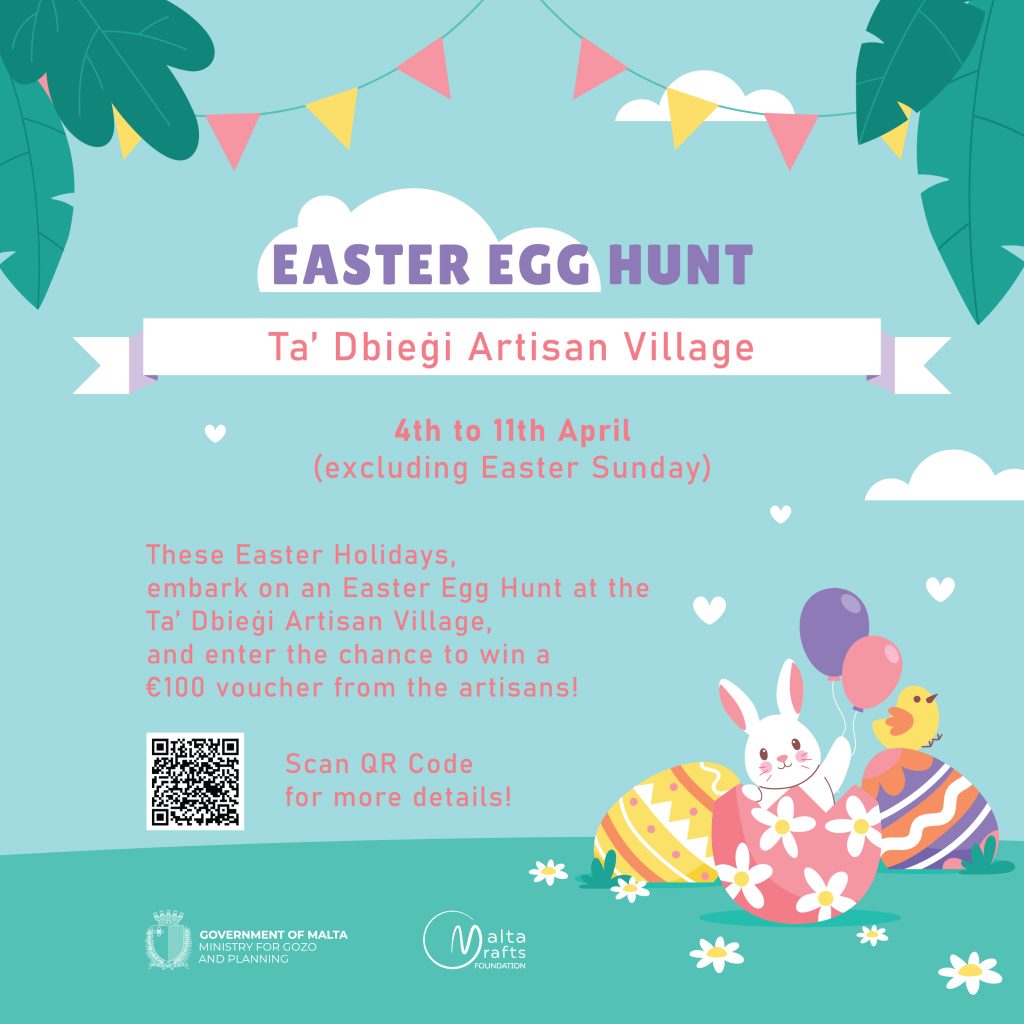 During the Easter holidays, visit the Ta’ Dbieġi Artisan Village in Għarb and take part in a fun Easter Egg Hunt set around the village. Each artisan will have a hidden Easter egg in their shop, with some eggs specially handcrafted by the artisans themselves. The hunt runs throughout the Easter holiday period, allowing you to choose the day that suits you best. By submitting photos of all the eggs you find, you will be entered into a draw to win a €100 voucher, redeemable on your favourite artisan products at the Ta’ Dbieġi Artisan Village.