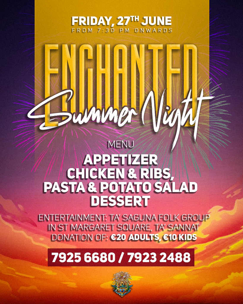 Join us for a magical night at the Enchanted Summer Night dinner, a special part of our St. Margaret’s Feast celebrations. Enjoy a delightful meal, live entertainment by the renowned Ta’ Saguna Folk Group, and a warm community atmosphere.