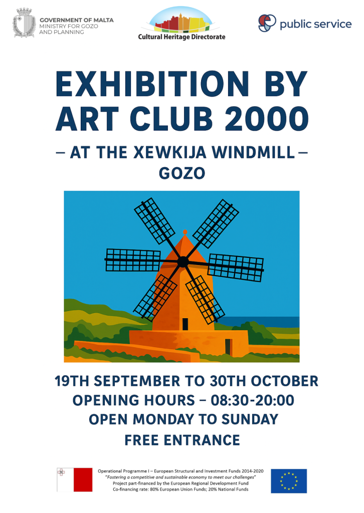 The Art Club 2000 Exhibition will take place at the Xewkija Windmill, offering art enthusiasts and visitors a unique chance to experience local creativity within a historic and culturally rich setting.