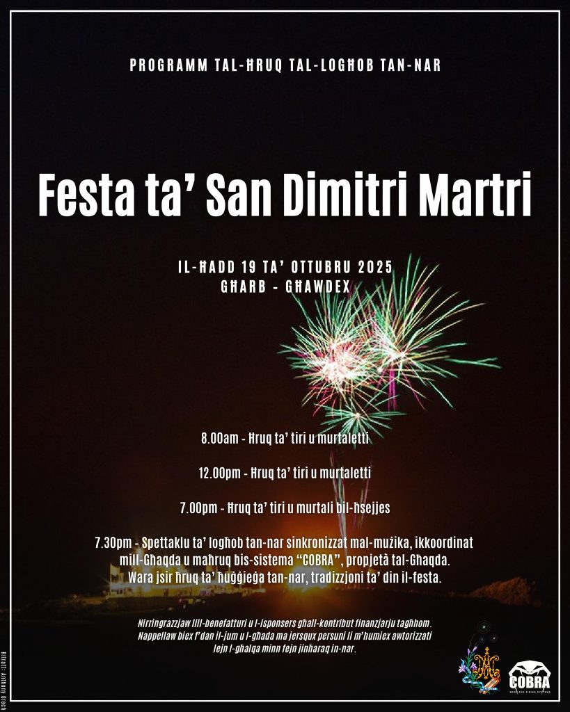 After the fireworks, the traditional bonfire—a cherished element of the feast’s heritage—will be lit, bringing the community together in a warm and festive atmosphere. This annual event is more than a celebration; it’s a tribute to Għarb’s cultural identity and the enduring spirit of its people.