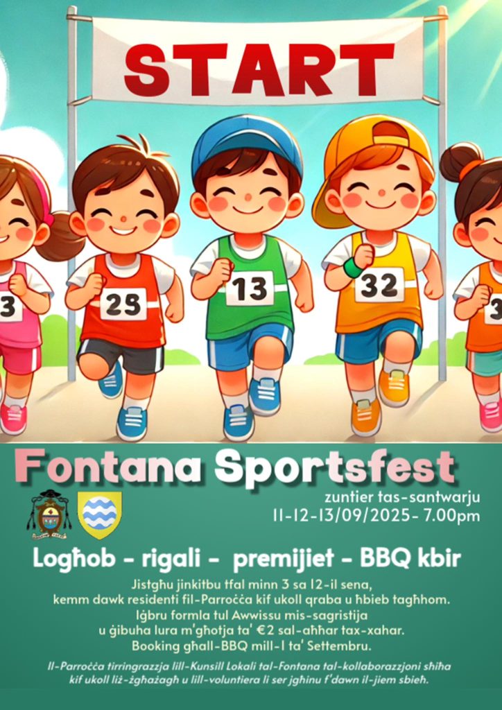 Fontana Sportsfest will take place in the parish square from the 11th to the 13th of September 2025 at 7:00 pm. Children aged between 3 and 12 years old can participate, including both parish residents and their relatives or friends. The event will include games, gifts, prizes, and a big BBQ. Registration forms are available from the sacristy during August, with a small fee of €2, and must be returned by the end of the month.