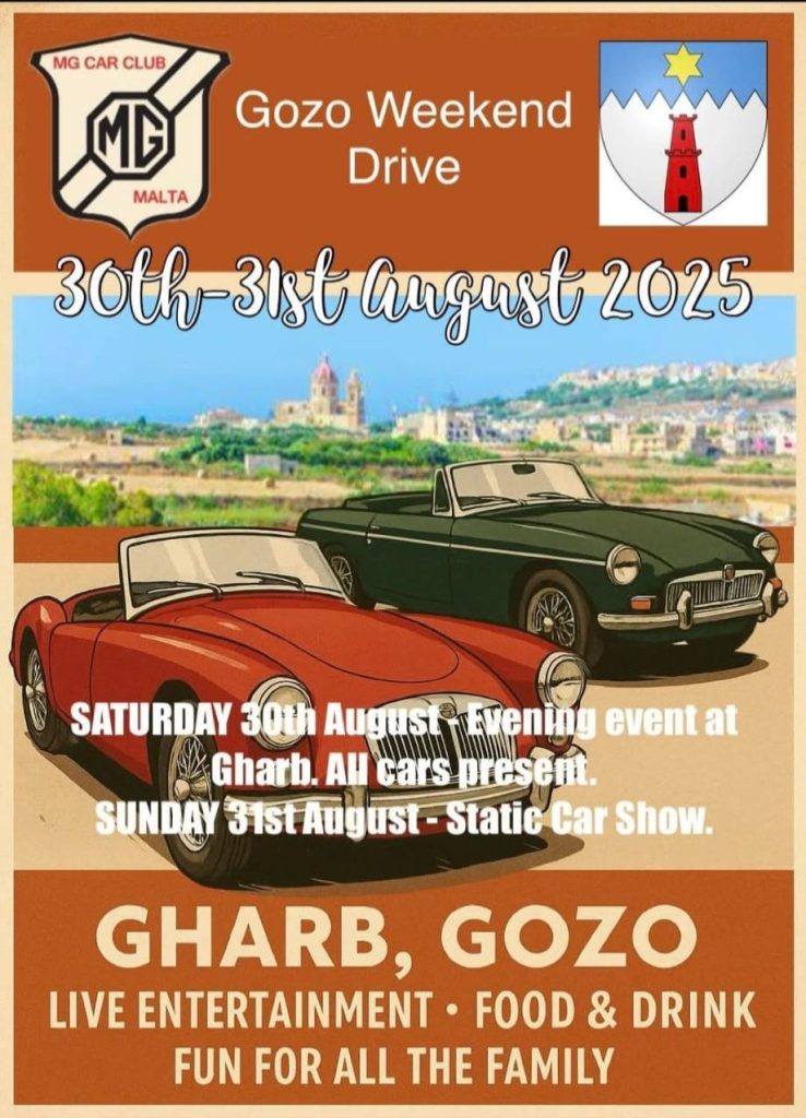 Join us for a lively Karaoke Night & Classic MG Cars event on Saturday, 30th August, starting from 7:30 pm in Għarb Square! Enjoy an unforgettable evening filled with music, laughter, and stunning classic MG cars on display, right in the heart of Għarb. DJ Salvo will be hosting and animating the karaoke session, so feel free to grab the mic, sing your favorite songs, and dance the night away. During dinner, take advantage of special discounted prices on ‘San Valentino’ Marsovin wine. For table reservations, call 7939 2596 or 9945 7173.