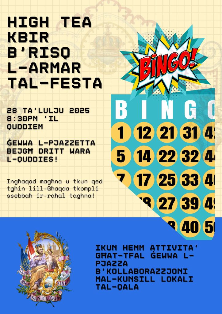 Enjoy a delightful High Tea and a lively Bingo session, all while supporting the local feast decorations committee! There will also be children’s activities in the square, in collaboration with the Qala Local Council. Be part of the celebration and help us keep beautifying our village!