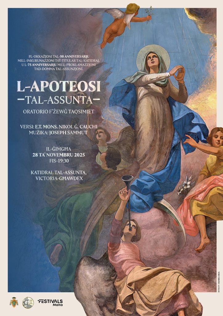 To mark the 50th anniversary of the crowning of the Cathedral’s titular statue and the 75th anniversary of the proclamation of the Dogma of the Assumption, we proudly present L-Apoteosi Tal-Assunta, an extraordinary oratorio in two parts. This monumental work celebrates faith, devotion, and musical artistry, weaving together sacred texts, powerful choruses, and moving orchestral passages.