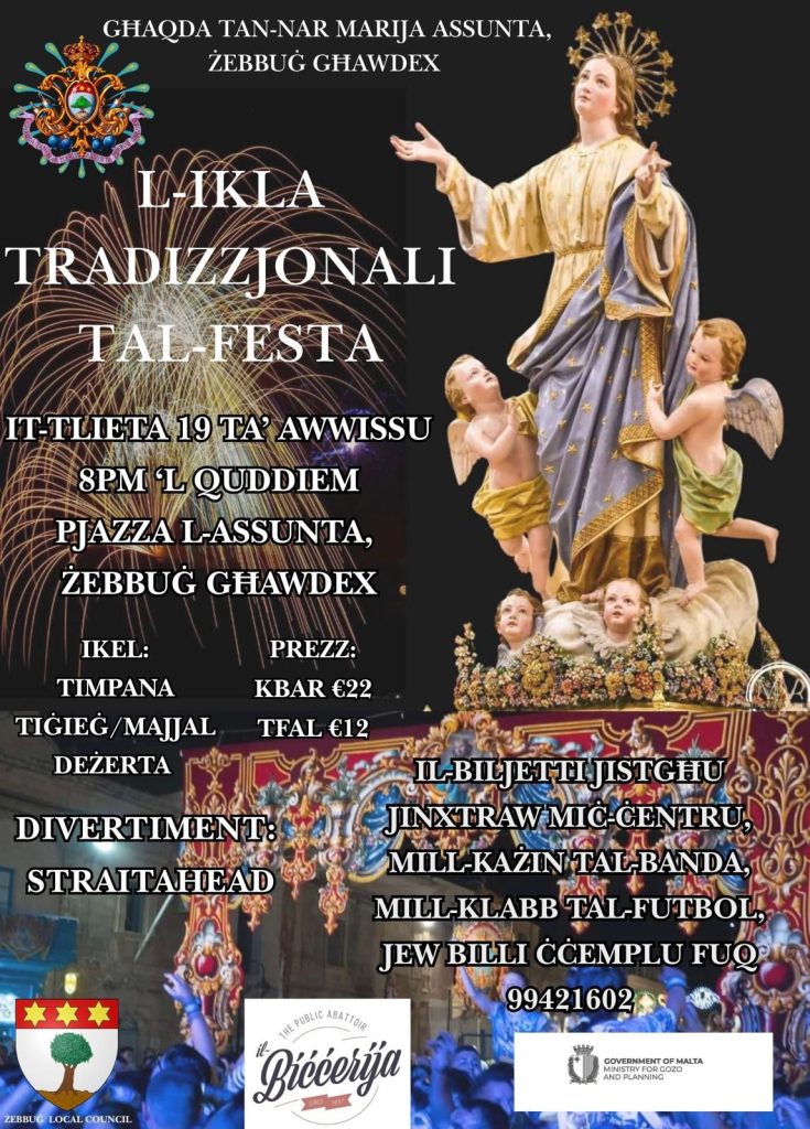 The Għaqda tan-Nar Marija Assunta of Żebbuġ, Gozo is organising the traditional dinner feast. The event will feature a delicious menu including timpana, chicken or pork, and dessert. Entertainment for the evening will be provided by the band Straitahead.