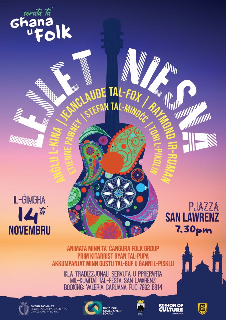 Join us for Lejlet il-Għana u Folk, a vibrant evening celebrating traditional Maltese music and culture! Enjoy live performances by talented artists including Anġlu l-Kina, JeanClaude tal-Fox, Raymond ir-Ruman, Etienne Pawney, Stefan tal-Minċoċ, and Tonil-Pikolin, with music animated by Ċangura Folk Group and guitarist Ryan tal-Pupa. The evening will also feature traditional dishes prepared by the Kumitat tal-Festa San Lawrenz.