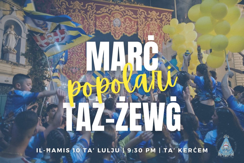 The procession departs from Avukat Anton Calleja Street. Participating bands include the Mnarja Band of Nadur and the Santa Marija Band of Żebbuġ.