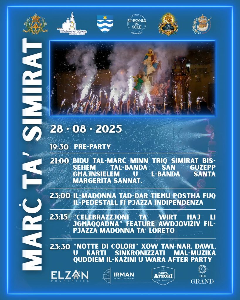 The Marċ ta’ Simirat, taking place on the 28th of August 2025, promises an evening of vibrant cultural celebration in Għajnsielem. The festivities begin with a Pre-Party at 19:30, followed by the march at 21:00 from Triq Simirat, featuring performances by the San Ġużepp Għajnsielem Band and the Santa Margherita Sannat Band. At 23:00, the Madonna tad-Dar will be placed on her pedestal in Pjazza Indipendenza, marking a significant moment in the evening. The celebrations continue at 23:15 with an audiovisual feature in Pjazza Madonna ta’ Loreto, honouring the living heritage that unites the community. At 23:30, the sky will light up during the “Notte di Colori” firework and light show, with synchronized music, lights, and confetti outside the kazin, followed by an energetic After Party to end the night on a high note.