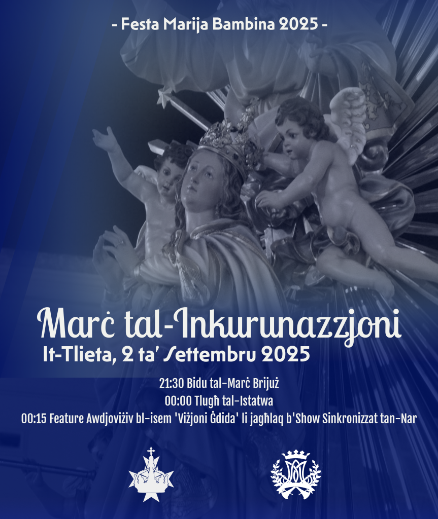 The “Festa Marija Bambina 2025” will feature the Marċ tal-Inkurunazzjoni on which begins at 9:30 PM with the Brijuż March, followed by the statue’s arrival at midnight. At 12:15 AM, a special audiovisual feature titled “Viżjoni Ġdida” will be presented, concluding with a synchronised fireworks show. This celebration promises to be a vibrant and spiritual experience, honouring the coronation of Our Lady.
