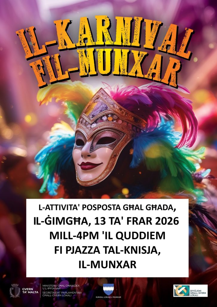 Due to the weather warnings issued by the authorities, the Carnival activity in Munxar is postponed to Friday 13th February @ 16:00