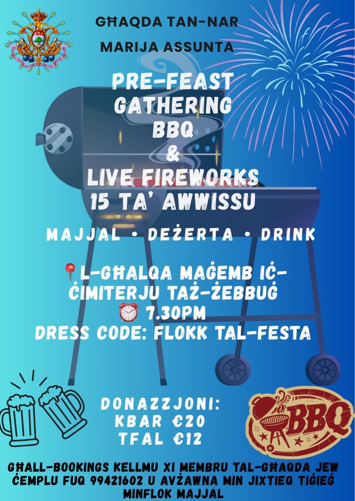 The Għaqda tan-Nar Marija Assunta is organising a Pre-Feast BBQ Gathering with Live Fireworks taking place in the field next to the Żebbuġ Cemetery. The event will include delicious barbeque food and attendees are encouraged to wear their festa t-shirt.