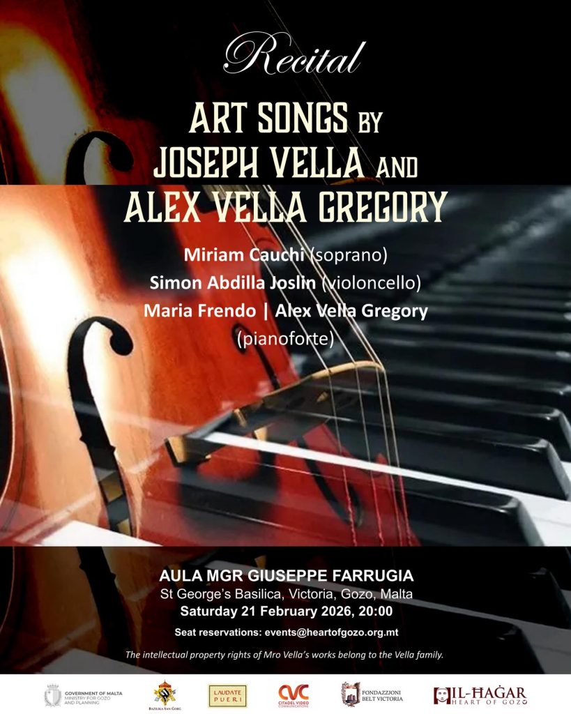 Join us for a melodious recital by Miriam Cauchi (soprano), Simon Abdilla Joslin (violoncello), and Maria Frendo and Alex Vella Gregory (pianoforte). The recital will feature a selection of art songs by Joseph Vella and Alex Vella Gregory set to Maltese texts by foremost Maltese poets.