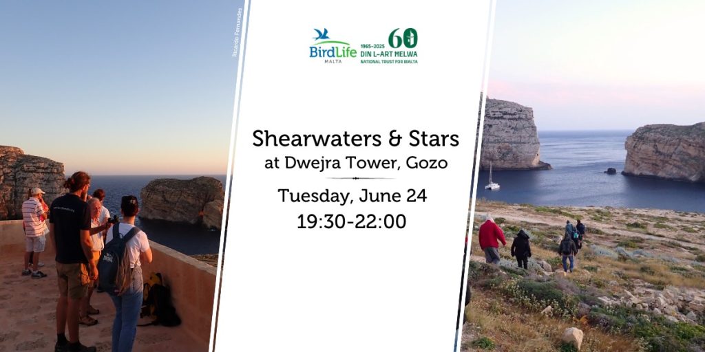 Come along for a magical evening at Shearwaters & Stars—an unforgettable experience combining nature, adventure, and wonder! Join us at the breathtaking Dwejra Tower in Gozo on Tuesday, June 24, from 19:30 to 22:00 as we explore the coastal cliffs, listen for the haunting calls of the mysterious shearwaters, and gaze at the star-filled sky.