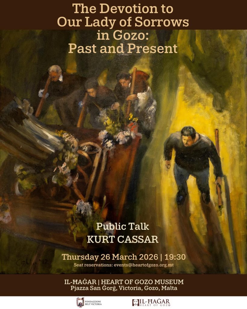During the eve of the popular commemoration of Our Lady of Sorrows in the Maltese Islands, Kurt Cassar will deliver a public talk in which he will explore the origins of this much-cherished devotion in Gozo. As with each day of Holy Week in Gozo, this commemoration is accompanied by a number of traditions which, over time, have been adopted and adapted from neighbouring countries to suit the local context. The lecture will trace how these traditions evolved and will also shed light on others that have since faded from memory.