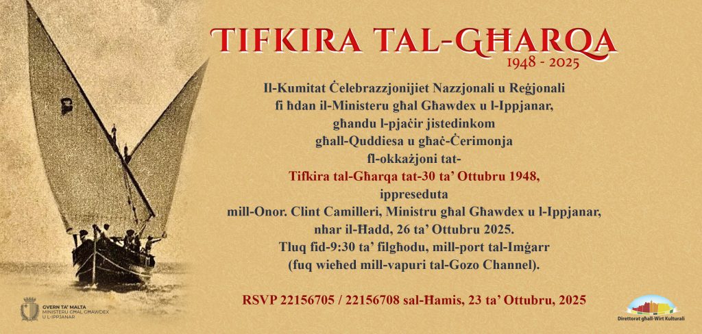 The ceremony will be presided over by the Hon. Clint Camilleri, Minister for Gozo and Planning, with the ferry departing from the Mġarr Port. Kindly reserve a place by Thursday, 23rd October, 2025.