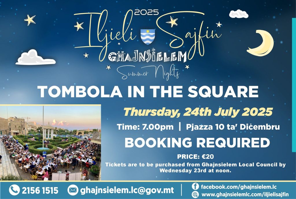 J us for the popular ‘Tombola in the Square’ on Thursday 24th July at 7:00pm in 10th December Square. Price €20 each and tickets are to be purchased from Għajnsielem Local Council by not later then the day before.
