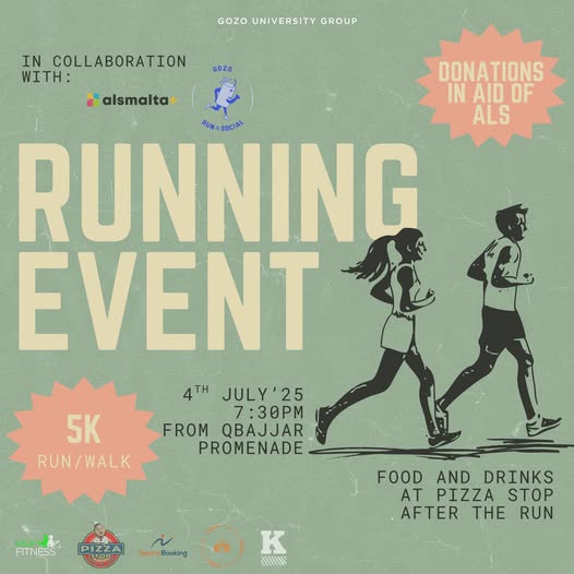 The final activity of the GUG sports weekend, a 5K run/walk with donations in aid of ALS! Afterwards, everyone is welcome to join for food and drinks at Qbajjar Promenade! This event is in collaboration with ALS Malta and Gozo Run & Social and all proceeds from the run will b donated to ALS Malta. Further information and updates can...