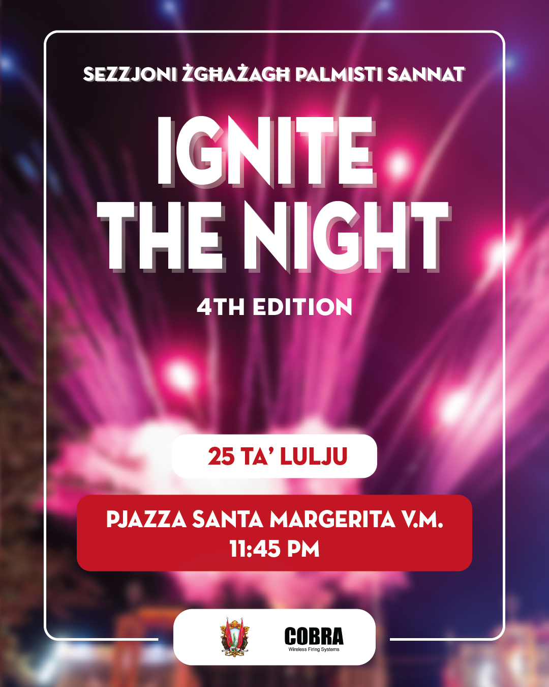 Join us for an electrifying night under the stars as Sezzjoni Żgħażagħ Palmisti Sannat proudly presents the 4th edition of "Ignite The Night" – a spectacular fireworks and music celebration lighting up the heart of Sannat! Expect a dazzling display of pyrotechnics fired by Cobra Wireless Firing System, vibrant energy, and a festive atmosphere that brings our community together in joy and tradition.