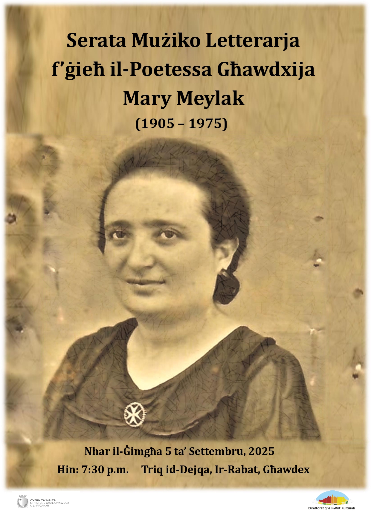 Join us for a commemorative evening honouring Gozitan poet Mary Meylak (1905–1975). The event will feature poetry readings of her work, a presentation of one of her novels, and musical interludes.