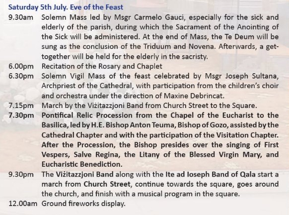 9.30amSolemn Mass led by Msgr Carmelo Gauci, especially for the sick and elderly of the parish, during which the Sacrament of the Anointing of the Sick will be administered. At the end of Mass, the Te Deum will be sung as the conclusion of the Triduum and Novena. Afterwards, a get-together will be held for the elderly in the sacristy....