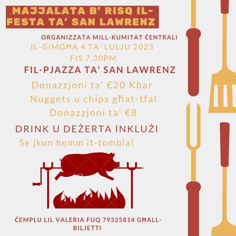 Join us for tasty food and a fun time with friends and family! For tickets call 99829780/79704840/79270074 or contact Marlene Xuereb on Messenger