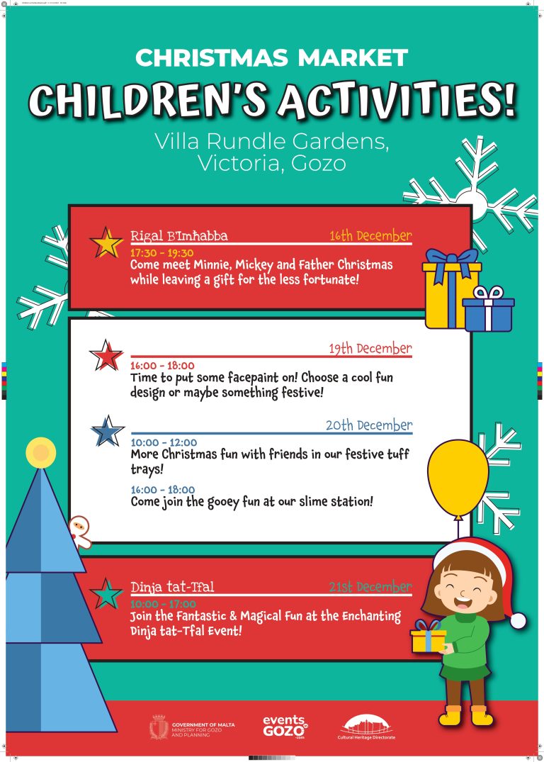 The Christmas Market at Villa Rundle Gardens in Victoria, Gozo is offering a lively programme of children’s activities spread across several festive days. On 16th December, families can enjoy Rigal Bl’Imħabba, where children are invited to meet cheerful characters like Minnie, Mickey, and Father Christmas while donating a gift to help those in need. The fun continues on 19th December...