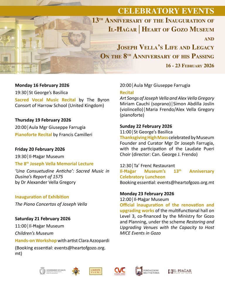 Il-Ħaġar Museum is pleased to announce the programme of events marking the 13th anniversary of its inauguration, and celebrating the life and legacy of the Maltese Islands’ foremost contemporary composer Joseph Vella on the 8th anniversary of his demise. A solemn Thanksgiving High Mass will be celebrated by the Museum’s Founder and Curator, Mgr Dr Joseph Farrugia, at St George’s...