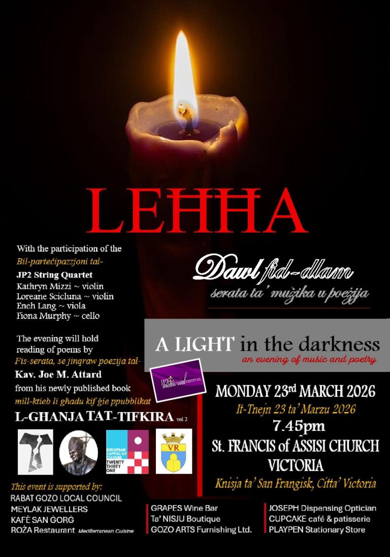 An evening of music and poetry during this preparatory time for the Holy Week “Leħħa Dawl fid-Dlam” - A light in the darkness. The evening will host the JP2 String Quartet composed of four female musicians residing in Gozo. They will be playing,  Fauré, Bach, Tartini, Vivaldi, Scumann, Mozart, Schubert, Lorenc, Handel, Albinoni and Pergolesi. For this occasion Chev. Joe...