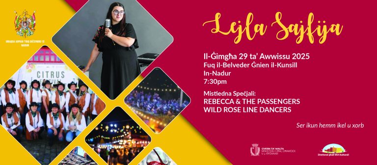 Experience a vibrant evening of music and dance in the picturesque village of Nadur. Lejla Sajfija, translated as A Summer Night, brings together the soulful sounds of Rebecca & The Passengers and the energetic performances of the Wild Rose Line Dancers. Set at the scenic Nadur Belvedere, this open-air event offers a lively celebration of local talent and community spirit. Food...