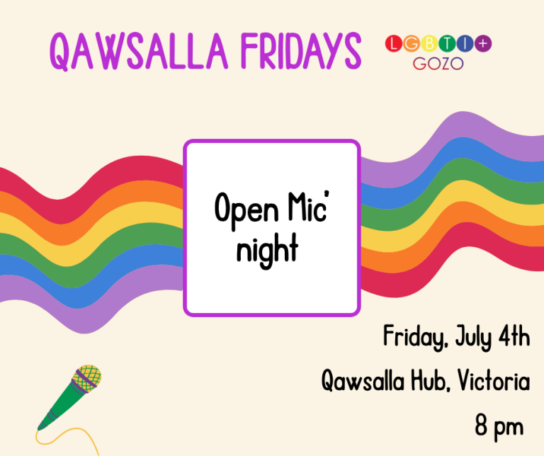 We’re launching Qawsalla Fridays — our hub will now open after hours once a month on Friday nights as Gozo’s only dedicated LGBTQIA+ space. A place to relax, connect, and just be you. Join us for a vibrant LGBTI+ Open Mic Night! Whether you’ve got a joke to tell, a story to share, a poem from the heart, a song to...