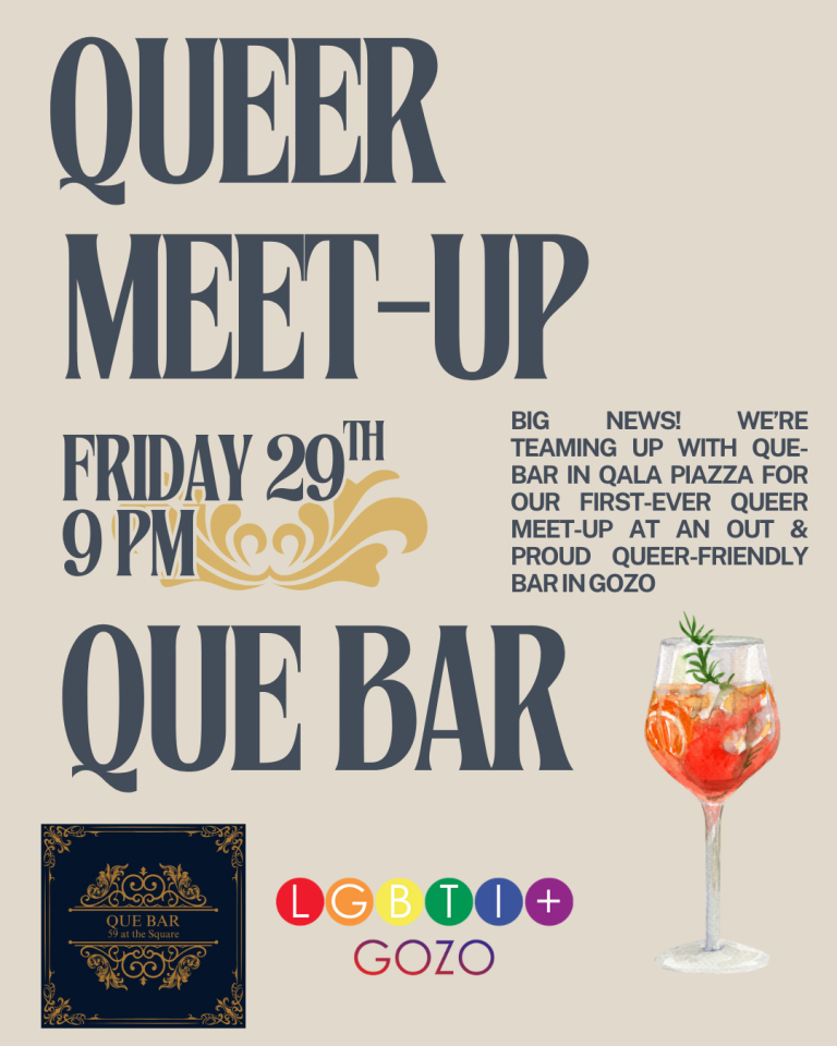 Big news! We’re teaming up with Que-Bar in Qala Piazza for our first-ever queer meet-up at an out & proud queer-friendly bar in Gozo . Join us for a night of good vibes and community connection!