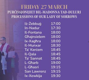 This Lent season, we warmly invite you to join us in the Solemn Procession of Our Lady of Sorrows through the picturesque villages of Gozo. Let us walk together in prayer and reflection, meditating on the profound sorrows of our Blessed Mother and drawing closer to her Son, our Lord Jesus Christ. Let us offer our hearts in faith, devotion,...