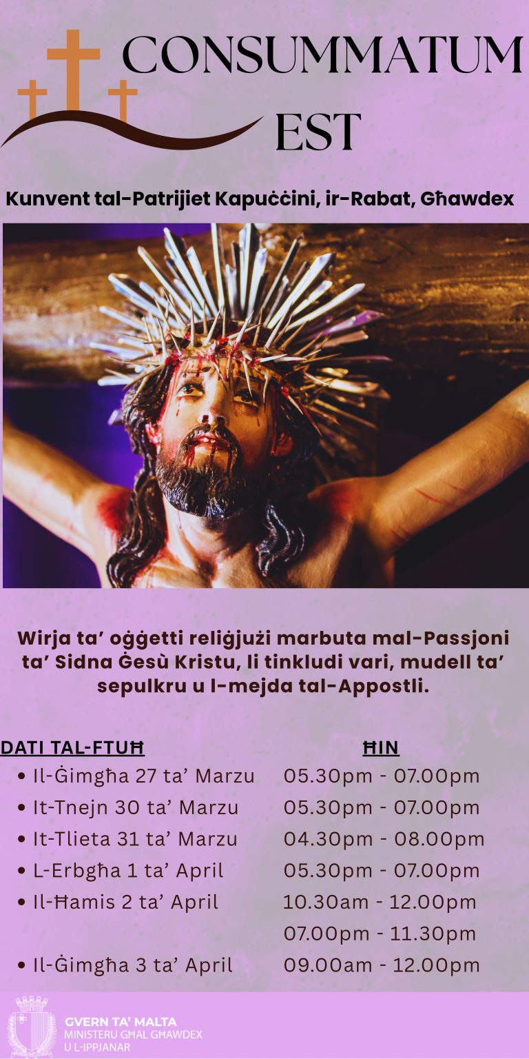 An exhibition featuring sixty finely crafted figurines depicting salient moments from the Passion of the Christ, carved in clay by local artist Manwel Gauci. Commissioned by Eżekiel Grima, the figurines are set against evocative scenery meticulously designed and built by him, creating a powerful visual narrative that guides visitors through the sorrow, sacrifice, and redemption at the heart of the...