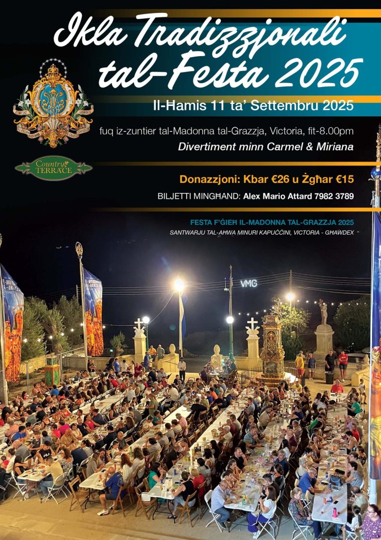 Join us for a delightful traditional dinner feast held  on the steps of the Sanctuary of Our Lady of Graces in Victoria. Enjoy a warm evening of great food, community spirit, and live entertainment by Carmel & Miriana, all in celebration of the beloved Festa tal-Madonna tal-Grazzja. Don’t miss this wonderful opportunity to experience the true flavour of Gozitan festivity!