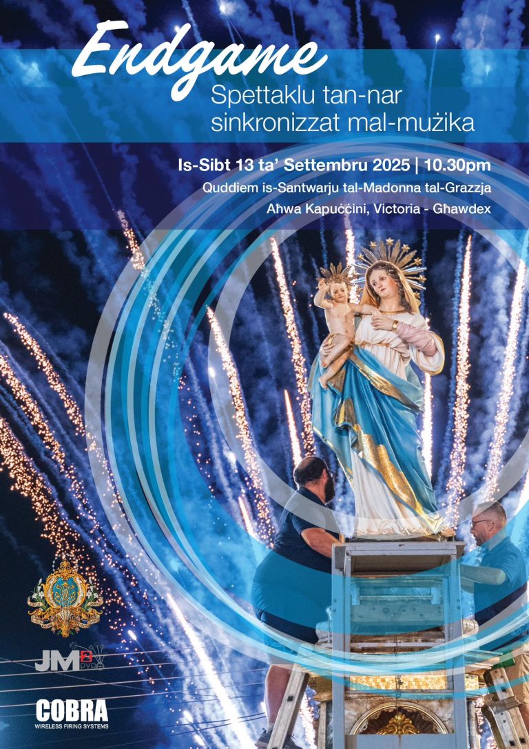 Join us for "Endgame", a spectacular fireworks show synchronised with music! The event will take place in front of the Sanctuary of Our Lady of Graces in Victoria. Experience a dazzling display of pyrotechnics perfectly timed to an epic musical soundtrack. Don’t miss this unforgettable night of celebration, tradition, and awe-inspiring light!
