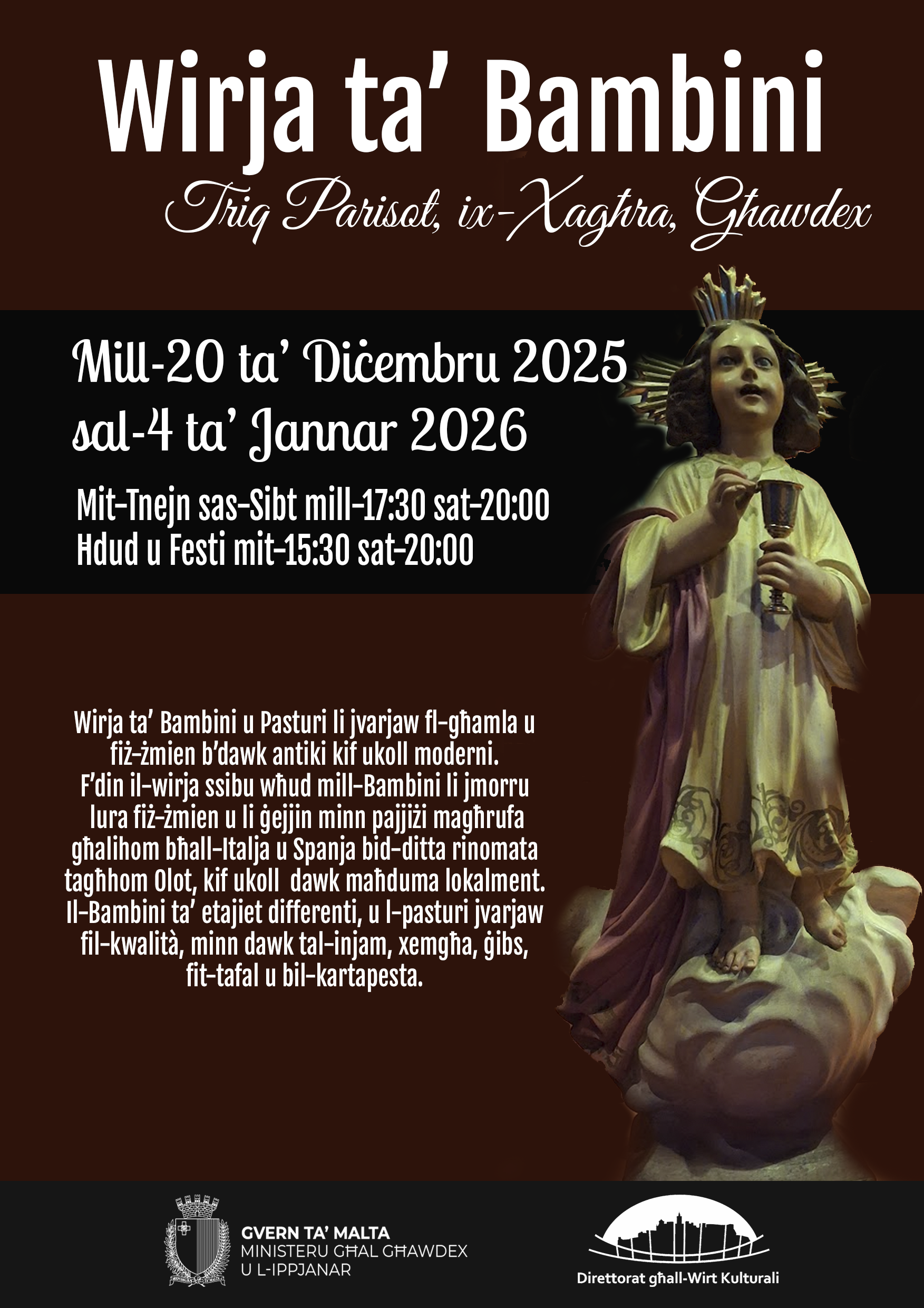 An exhibition featuring Baby Jesus statues, cribs, and statuettes crafted by various artists in a traditional Maltese manner. This unique showcase celebrates the rich heritage of Maltese craftsmanship, highlighting the artistry, devotion, and cultural symbolism behind the creation of baby Jesus figures. Visitors will have the opportunity to admire intricate handmade cribs, delicate statuettes, and nativity scenes that reflect both...