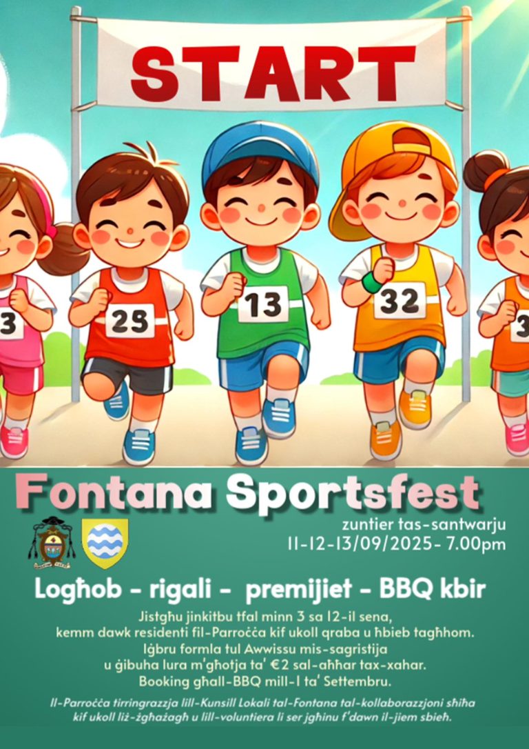 Fontana Sportsfest will take place in the parish square from the 11th to the 13th of September 2025 at 7:00 pm. Children aged between 3 and 12 years old can participate, including both parish residents and their relatives or friends. The event will include games, gifts, prizes, and a big BBQ. Registration forms are available from the sacristy during August,...