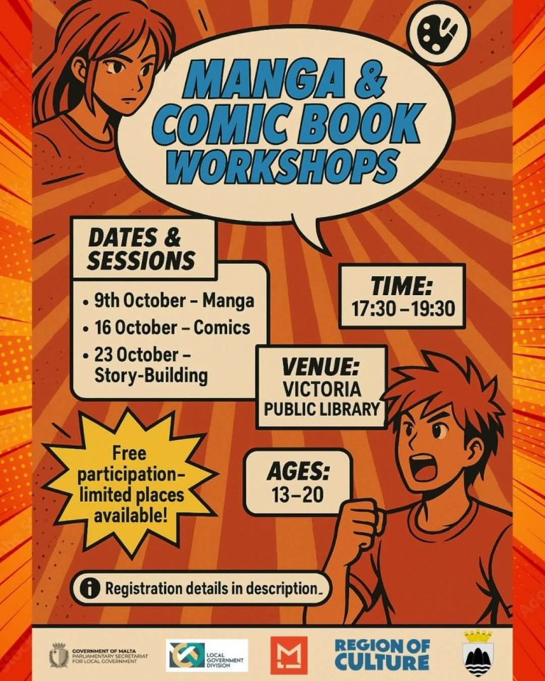As part of the activities for the Region of Culture in Gozo, the Gozo Central Public Library will open its doors to a colourful and exciting adventure featuring three separate workshop sessions. The first session will explore the Japanese art of Manga, to reveal the techniques behind Japan's popular art style, while the second session will allow participants to dive...
