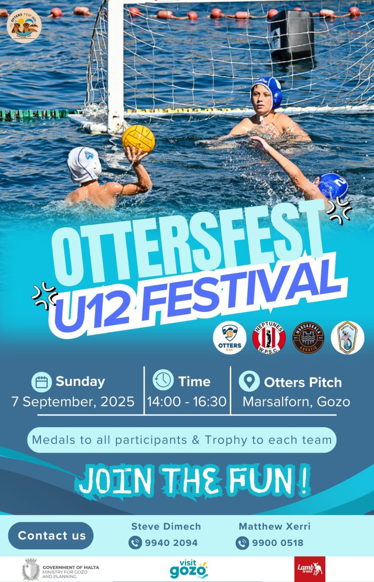 The Otters Fest U12 Festival offers a fantastic opportunity for young players to come together and enjoy waterpolo in a fun and supportive environment. The event promises an afternoon of exciting matches, teamwork, and learning. With clubs like Otters A.S.C., Neptunes W.P.S.C., Marsaskala Aquatic, and others participating, it’s a celebration of youth waterpolo at its best. All participants will receive...
