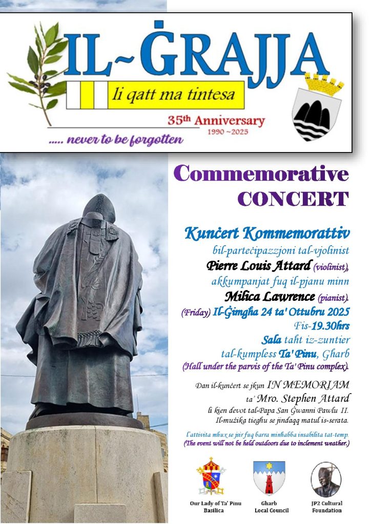 To commemorate the 35th anniversary of Il-Ġrajja, a special concert will be held under the parvis of the Ta’ Pinu complex. The concert will feature violinist Pierre Louis Attard, accompanied by internationally acclaimed pianist Milica Lawrence. This commemorative event is dedicated In Memoriam to Mro. Stephen Attard, a devoted follower of St. John Paul II, whose music will be performed...