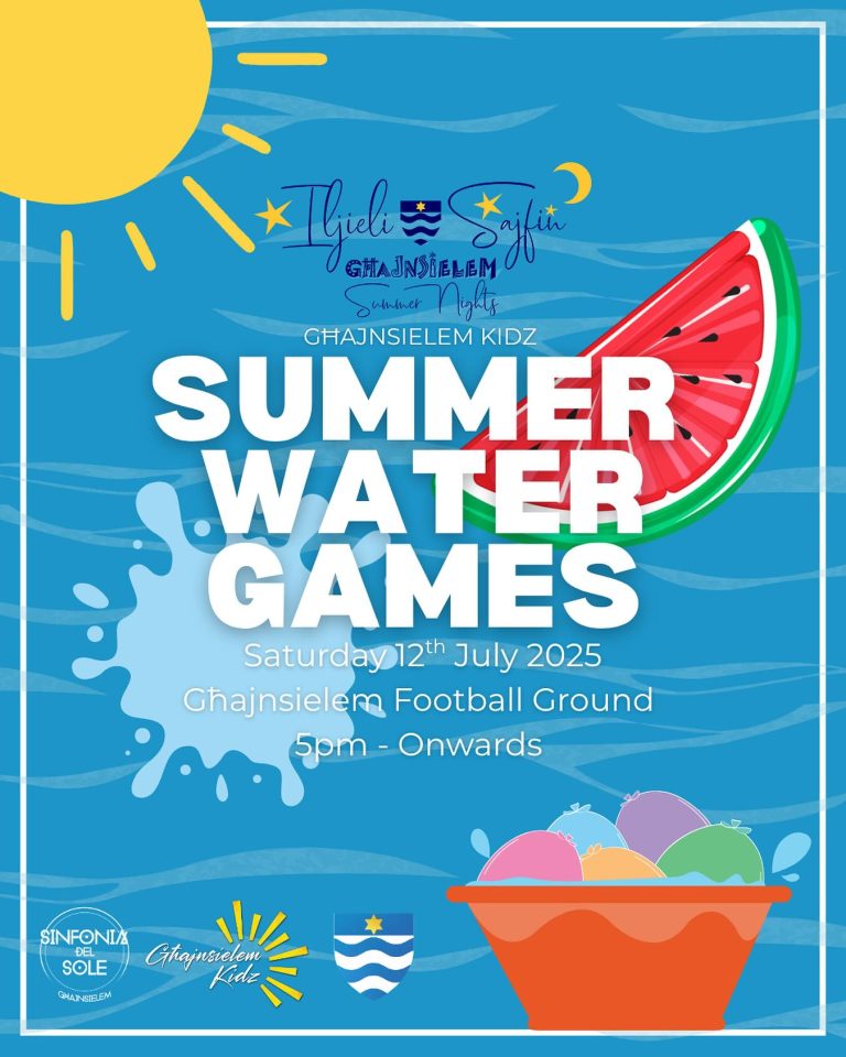 Get ready to splish, splash and have some fun! All kids registered for Għajnsielem Kidz are welcome to come and take part. Those kids that aren’t registered and wish to join the games, can give a donation of €5 and will be able to take part. More info: 99556091 Visit www.ghajnsielemlc.com/iljielisajfin for calendar of events.