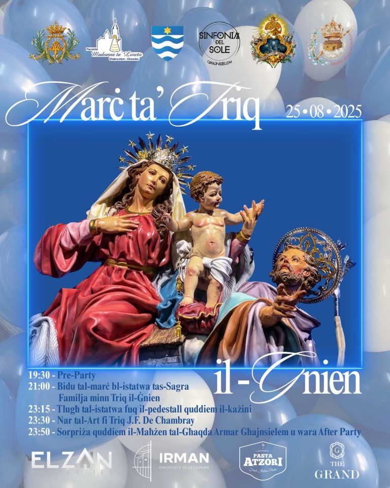Join us for the vibrant Marċ ta’ Triq il-Ġnien in Għajnsielem – an unforgettable evening of celebration, devotion, and community spirit! The festivities kick off at 7:30pm with a lively pre-party, followed by the grand street march at 9:00pm featuring the statue of the Sacred Family starting from Triq il-Ġnien. As the night unfolds, enjoy the statue’s arrival at the club...