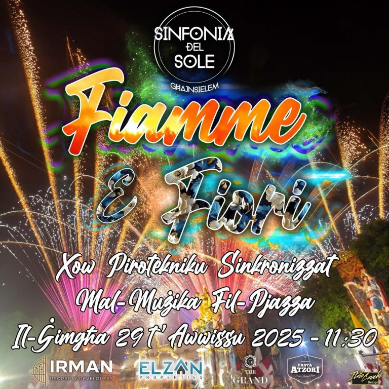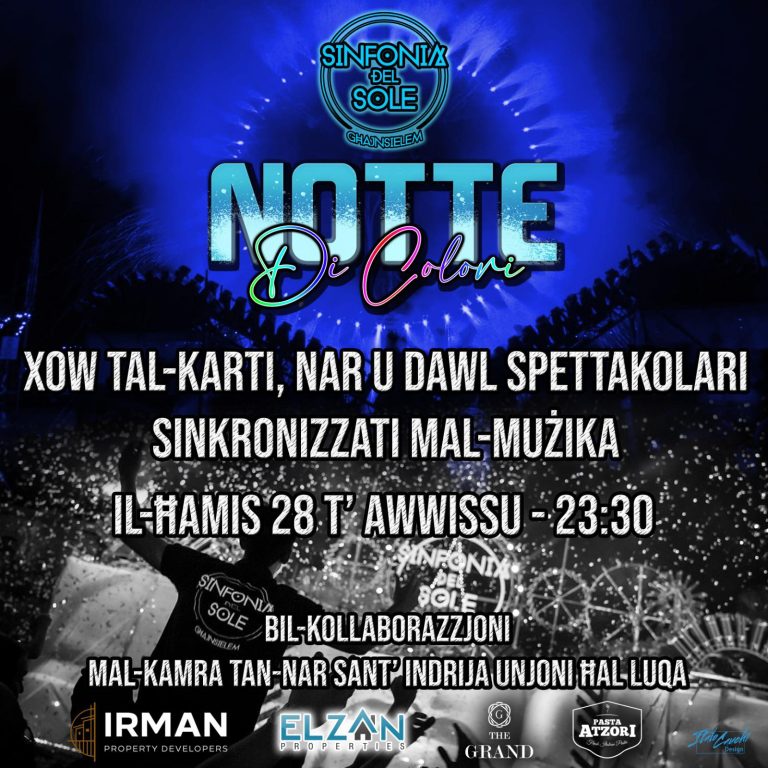 Sinfonia del Sole Għajnsielem proudly presents Notte di Colori – a spectacular night of colour, fire, and lights synchronised to music! Join us for an unforgettable experience featuring a breathtaking show of paper effects, fireworks, and lighting displays.