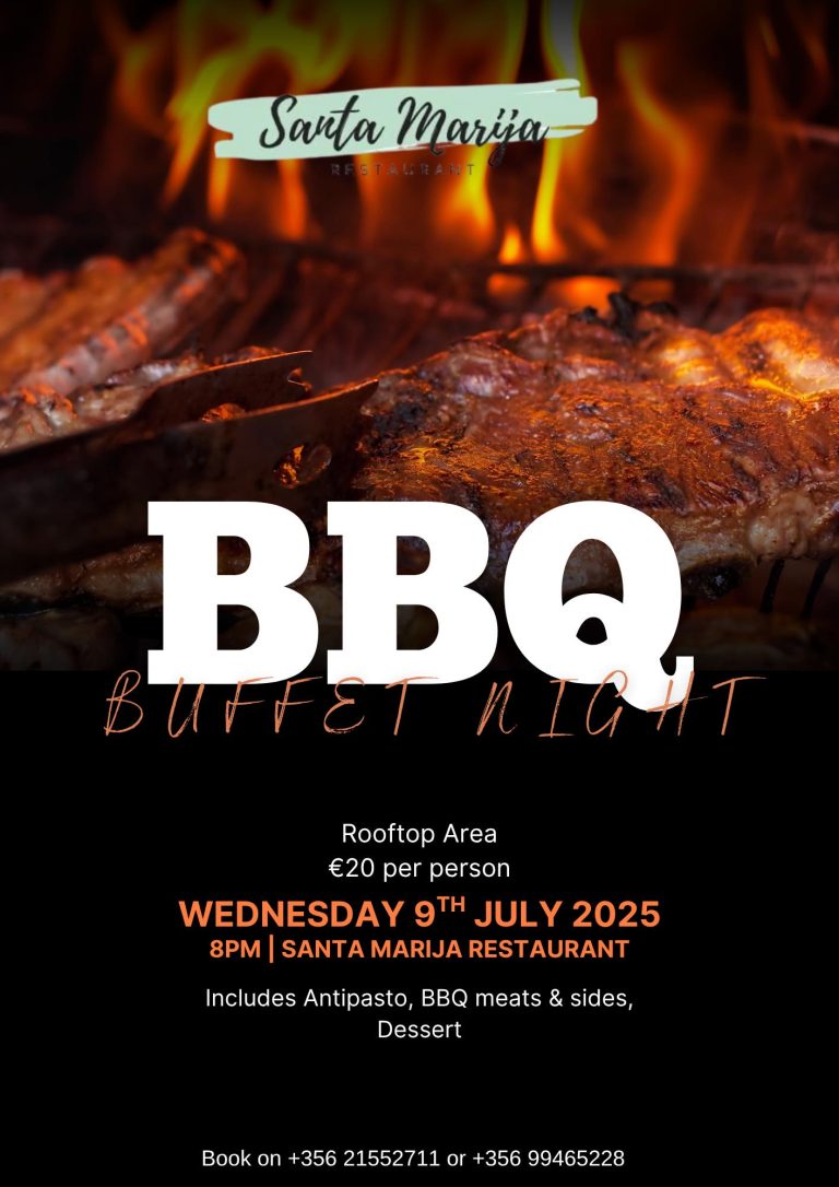 Join us with family and friends for an amazing evening under the stars for a sizzling BBQ on the Rooftop! Booking is essential – limited spaces available! Call or Message us on WhatsApp to reserve your spot on: (+356) 21552711 or (+356) 99465228