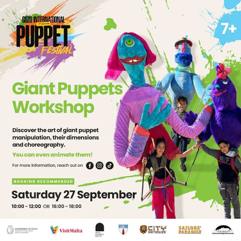 Join the Giant Puppets Workshop at the Gozo International Puppet Festival on Saturday, 27 September, and dive into the fascinating world of giant puppet manipulation! Suitable for both young audiences and adults aged 7 and up, this exciting hands-on experience will introduce you to the art of puppet choreography, movement, and understanding their impressive scale. You’ll even have the chance...